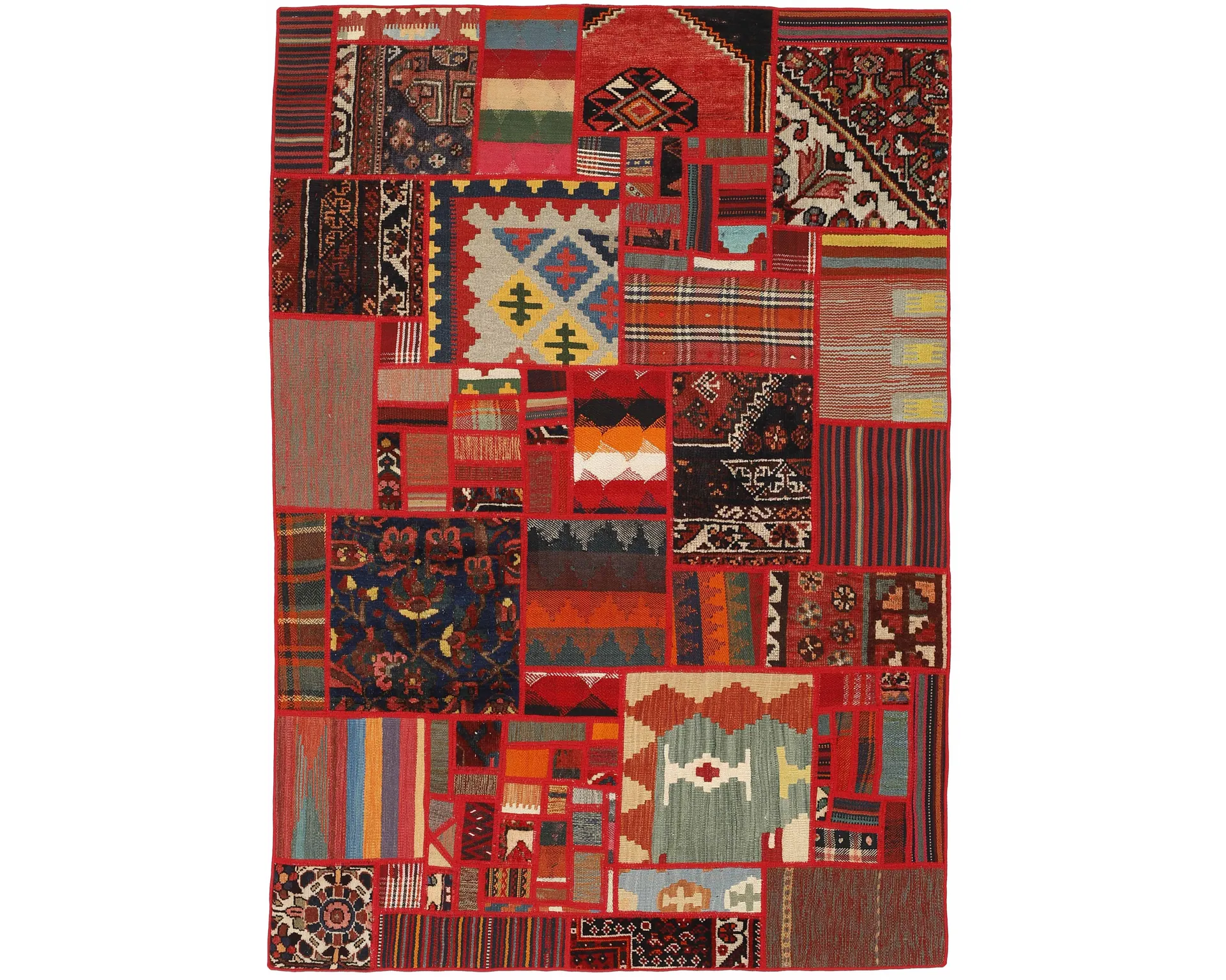 Tekkeh Kelim mattor tillverkas av bitar från gamla Kelim ullmattor. Bitarna sys ihop och slutligen fästs på ett bottenmaterial. Dessa mattor skapas alltså genom att återanvända befintligt material samtidigt som man skapar unika, lapptäckesliknande mattor av traditionella persiska textilier. Oanvänd.