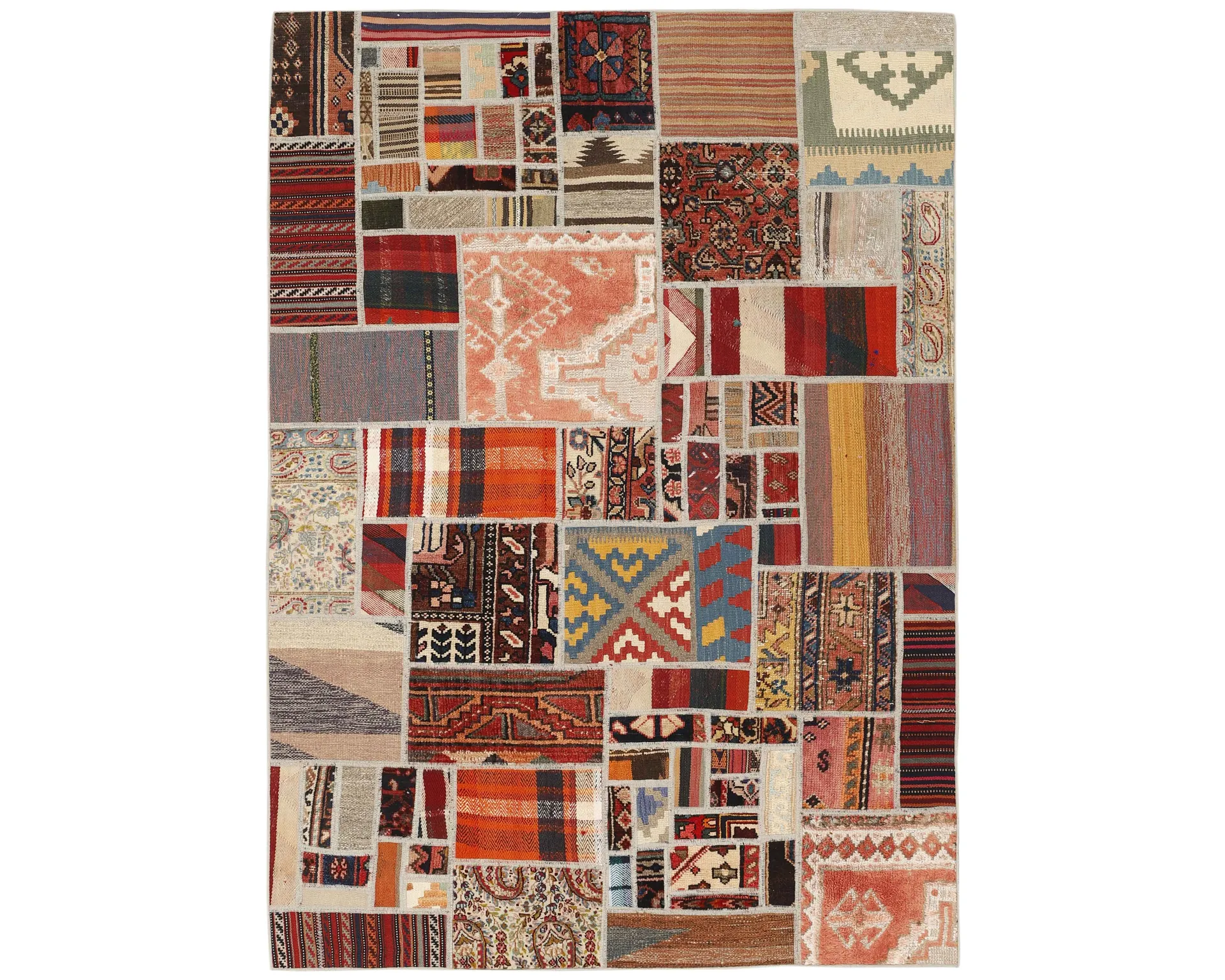 Tekkeh Kelim mattor tillverkas av bitar från gamla Kelim ullmattor. Bitarna sys ihop och slutligen fästs på ett bottenmaterial. Dessa mattor skapas alltså genom att återanvända befintligt material samtidigt som man skapar unika, lapptäckesliknande mattor av traditionella persiska textilier. Oanvänd.