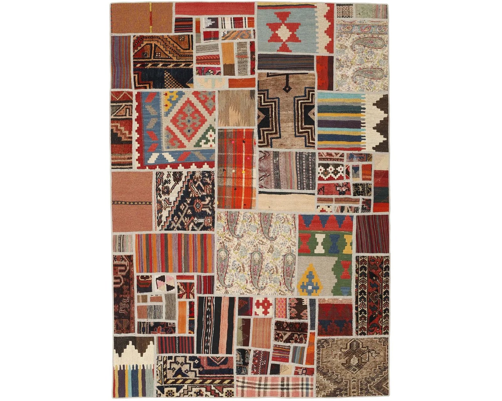 Tekkeh Kelim mattor tillverkas av bitar från gamla Kelim ullmattor. Bitarna sys ihop och slutligen fästs på ett bottenmaterial. Dessa mattor skapas alltså genom att återanvända befintligt material samtidigt som man skapar unika, lapptäckesliknande mattor av traditionella persiska textilier. Oanvänd.