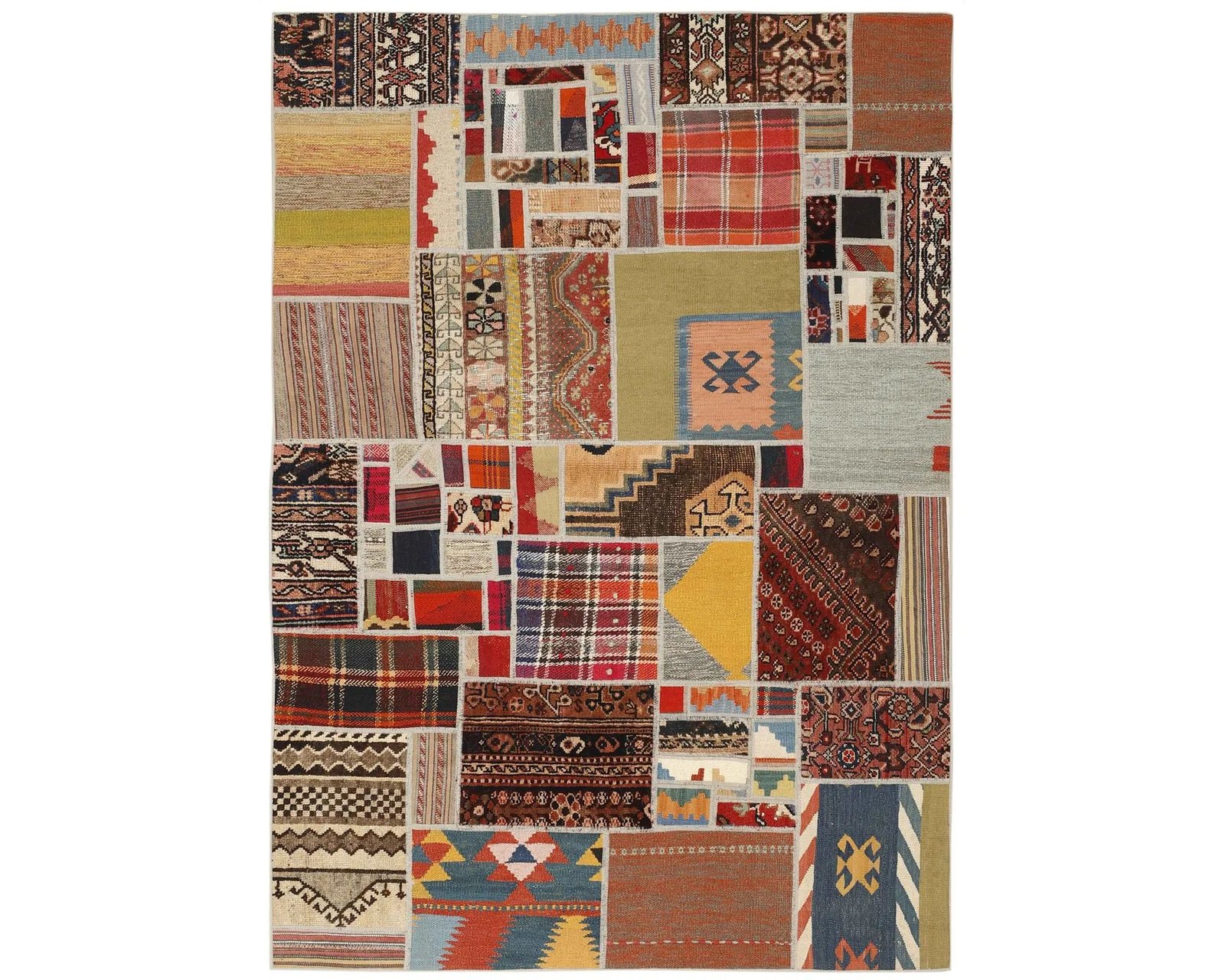 Tekkeh Kelim mattor tillverkas av bitar från gamla Kelim ullmattor. Bitarna sys ihop och slutligen fästs på ett bottenmaterial. Dessa mattor skapas alltså genom att återanvända befintligt material samtidigt som man skapar unika, lapptäckesliknande mattor av traditionella persiska textilier. Oanvänd.