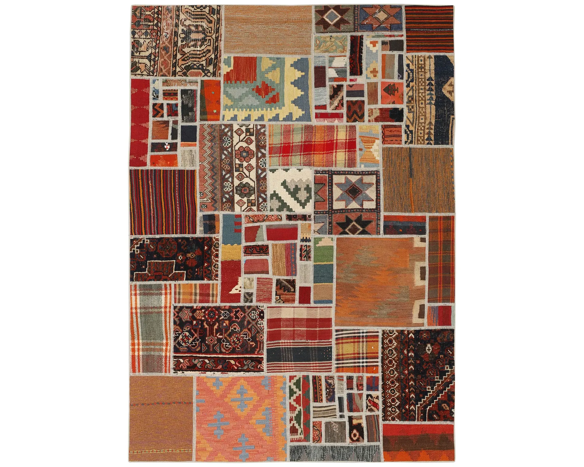 Tekkeh Kelim mattor tillverkas av bitar från gamla Kelim ullmattor. Bitarna sys ihop och slutligen fästs på ett bottenmaterial. Dessa mattor skapas alltså genom att återanvända befintligt material samtidigt som man skapar unika, lapptäckesliknande mattor av traditionella persiska textilier. Oanvänd.