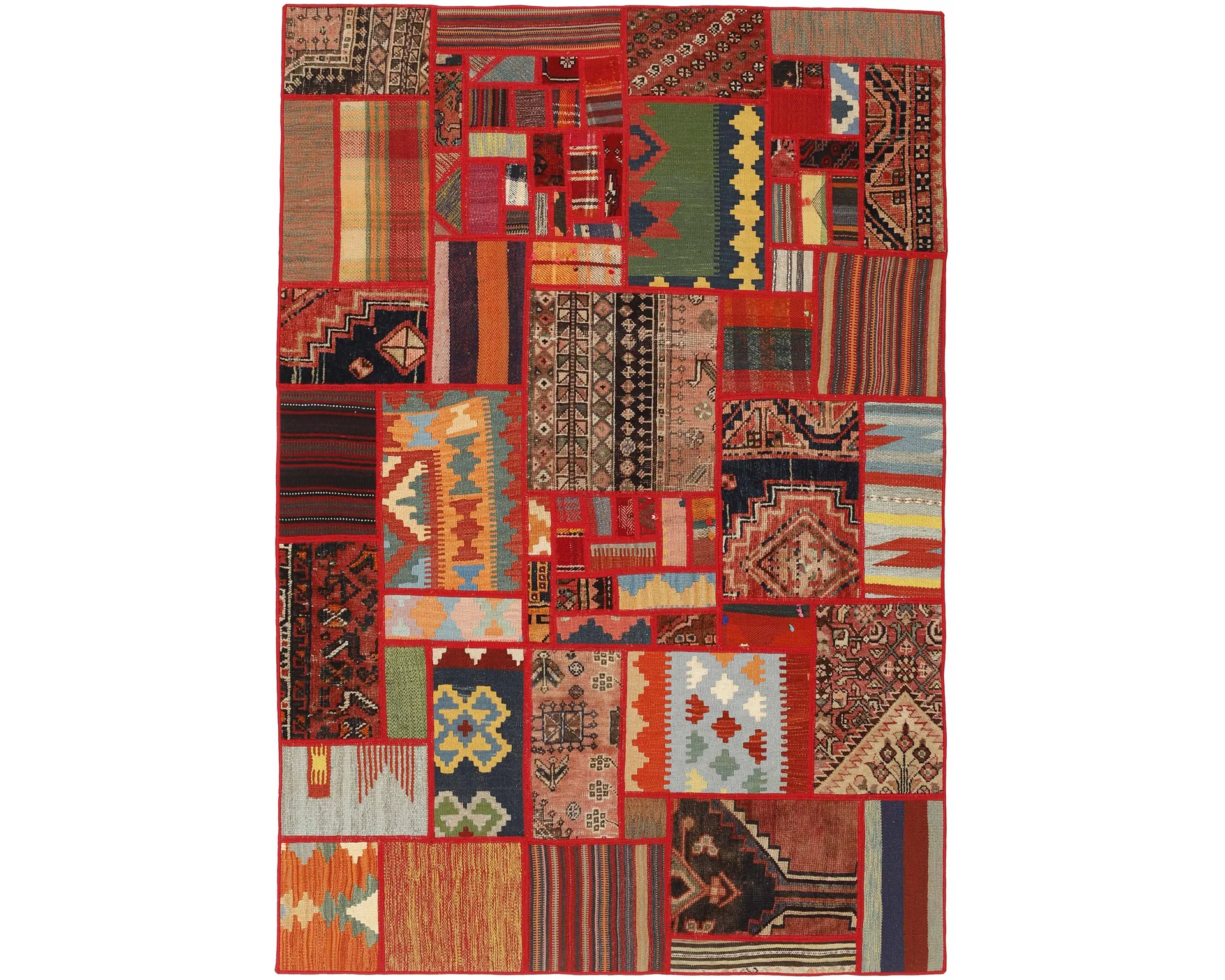 Tekkeh Kelim mattor tillverkas av bitar från gamla Kelim ullmattor. Bitarna sys ihop och slutligen fästs på ett bottenmaterial. Dessa mattor skapas alltså genom att återanvända befintligt material samtidigt som man skapar unika, lapptäckesliknande mattor av traditionella persiska textilier. Oanvänd.
