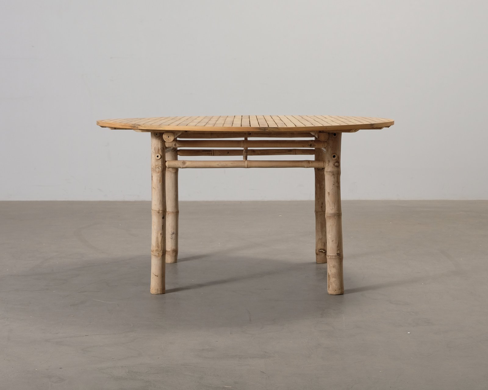 Tine K:s eleganta bambubord med en diameter på 140 cm. Den enkla designen gör att bordet passar in i alla rum och kan användas både inomhus och utomhus. Bambu är ett slitstarkt material som tål slitage väl och ger interiören en bohemisk och avslappnad känsla. Bordet är handgjort i Danmark. Bordsskivans och ramens mått stämmer inte överens, vilket gör att bordsskivan inte kan fästas på benen. Observera att bordet har en rustik karaktär.