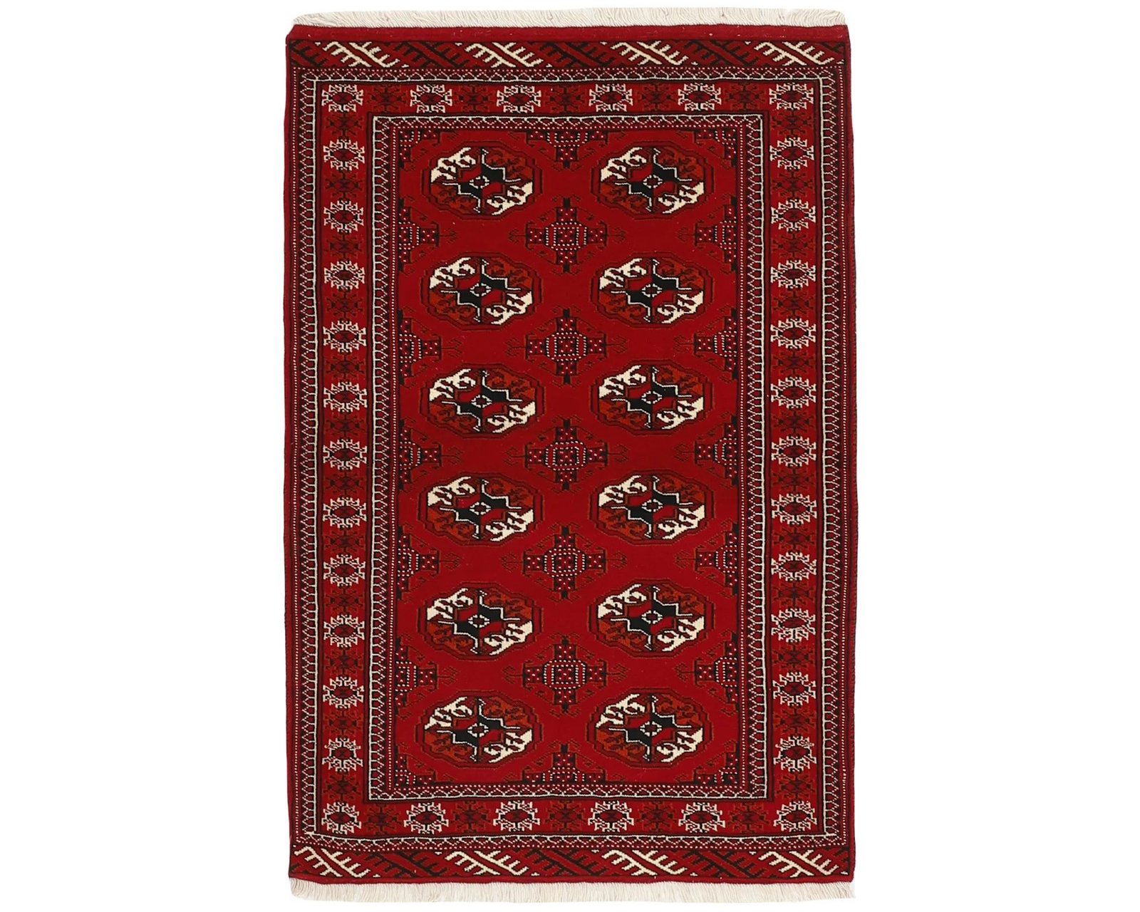 I Turkmenistan har nomadstammar specialiserat sig på att skapa Torkaman ullmattor. Dessa handknutna mattor med kort lugg är kända för sina breda kanter och en distinkt färgpalett där nyanser av rött, svart och naturvitt står i centrum. Dessa mattor är även smyckade med geometriska mönster som ofta symboliserar djur, växter och stjärnor. Bland de mest kända stilarna av Torkaman mattor finner vi Basjir, Salor, Tekke, Tjaudor och Yomut. Oanvänd.
