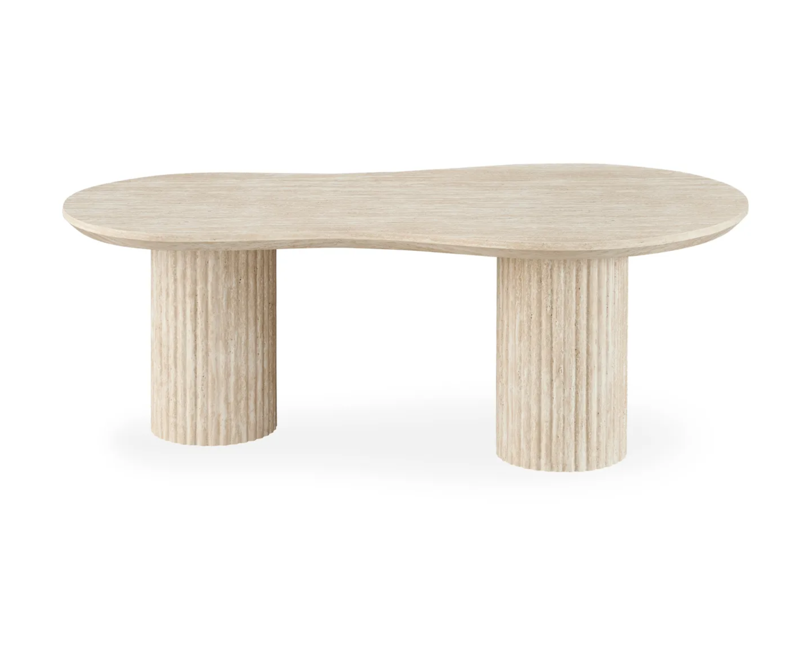 Elegant och modernt soffbord med asymmetrisk design. Den travertinfärgade looken skapar en lyxig och organisk atmosfär i inredningen. Tillverkat av MDF. Bordsskivan och benen har små skador.