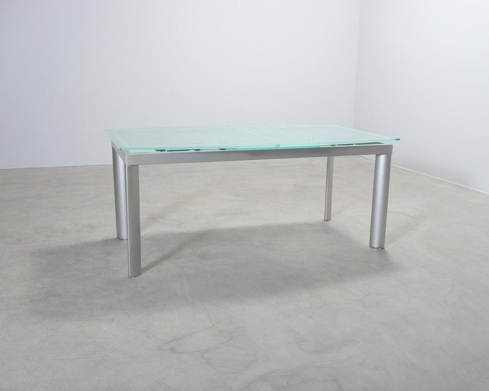 Utdragbart modernt matbord med skiva i glas. Ben i metall. Vanligt bruksslitage, i glasskivan småa repor.