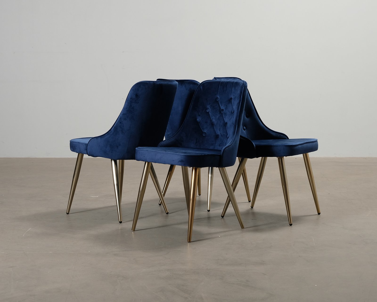 Velvet Deluxe är en elegant matstol som ger lyx till din inredning. Klädsel i blå sammet och guldfärgade ben. Stolens ben är lite olika långa, så de vinglar lite. En av stolarna saknar tassar. Små ytdefekter i klädseln och en buckla i sitsen på en stol.