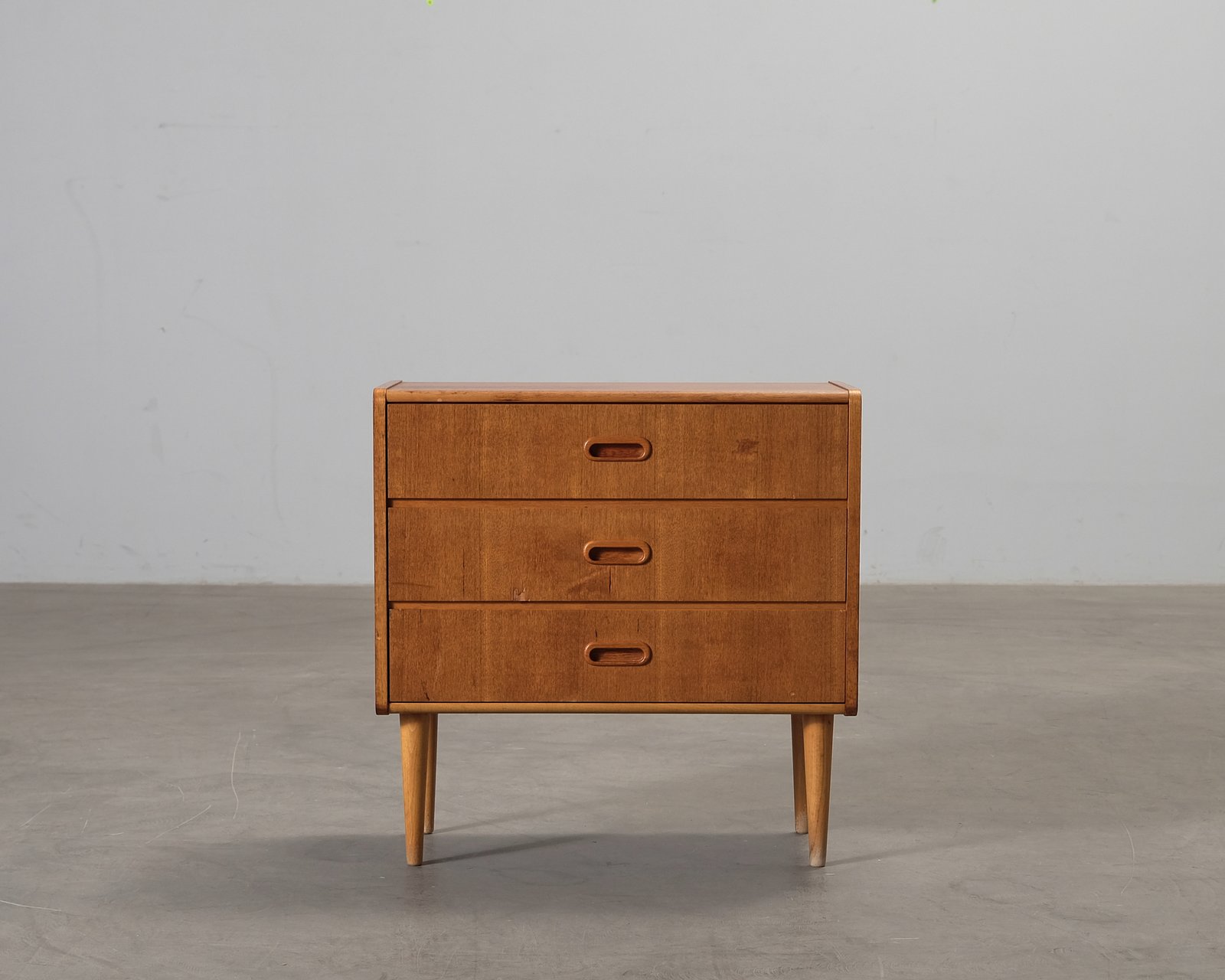 En liten vintagebyrå med tre lådor. Detta personliga och vackert patinerade möbelstycke passar särskilt den som uppskattar vintage-möblers unika charm. Den kompakta byrån är perfekt till exempel i hallen. Små tecken på användning. Helhetsintrycket är mycket gott. Byrån är från 1954.