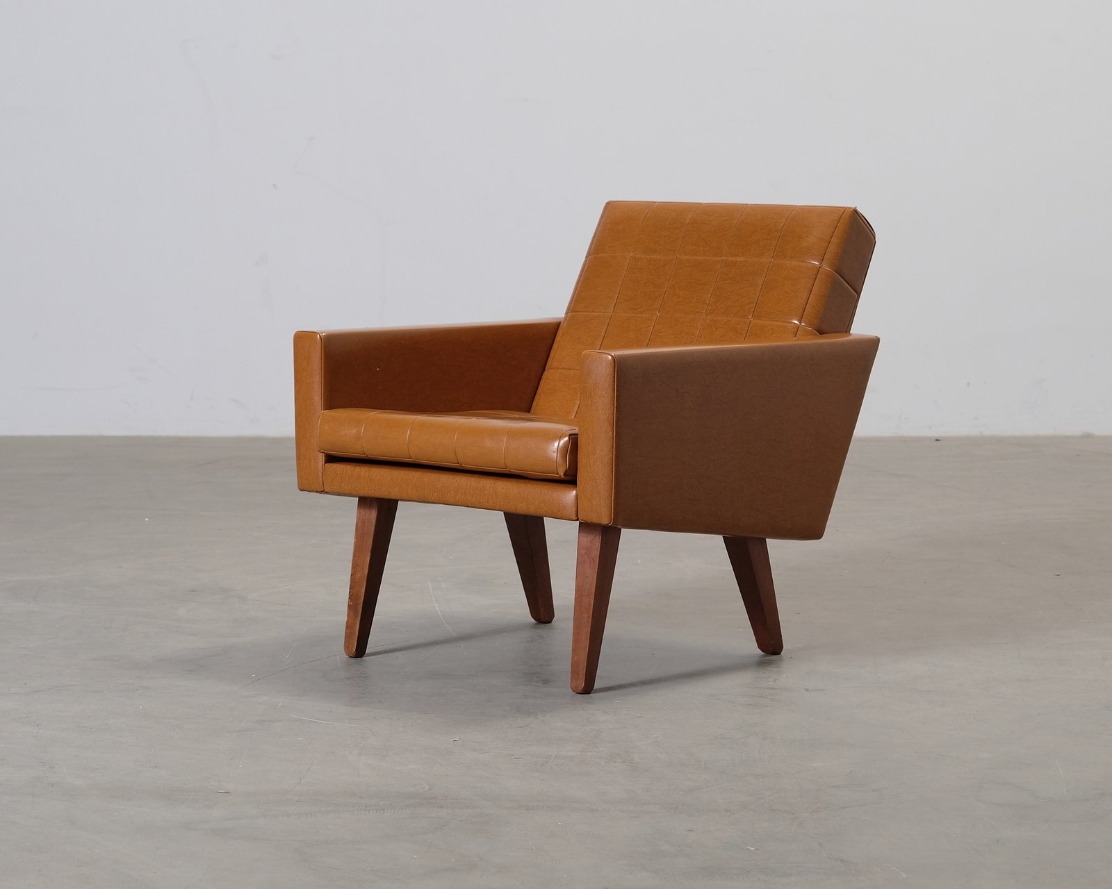 En fantastisk 1960-tals vintage-fåtölj som ger inredningen ett personligt karaktär. Brun konstläderklädsel och träben Normalt bruksslitage, patina, repor och ytfel. Den tidigare ägaren rökte i hemmet, men större delen av lukten har försvunnit.