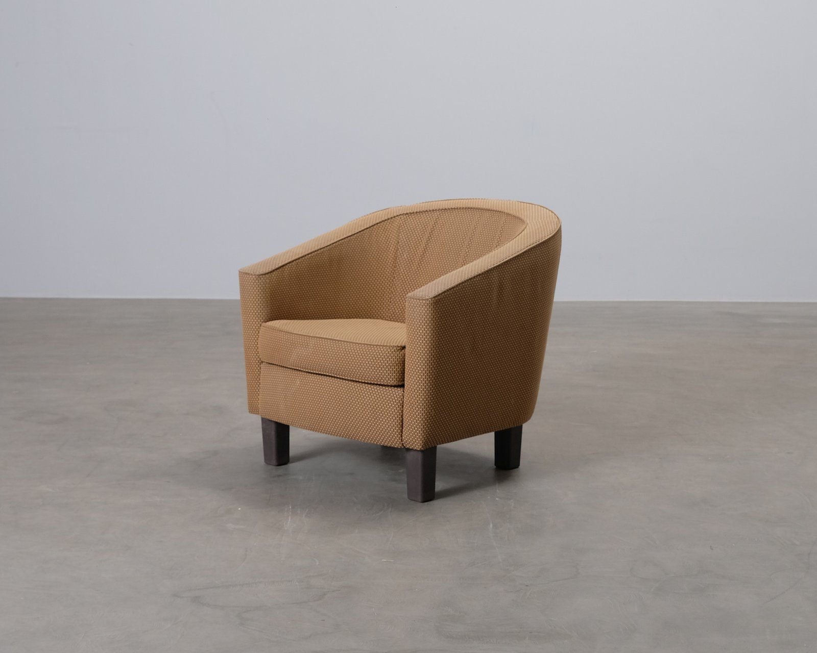Traditionell fåtölj med brun tygklädsel. Dessa vintagefåtöljer kommer från en herrgård i södra Finland. Smått bruksslitage, helhetsintrycket gott.