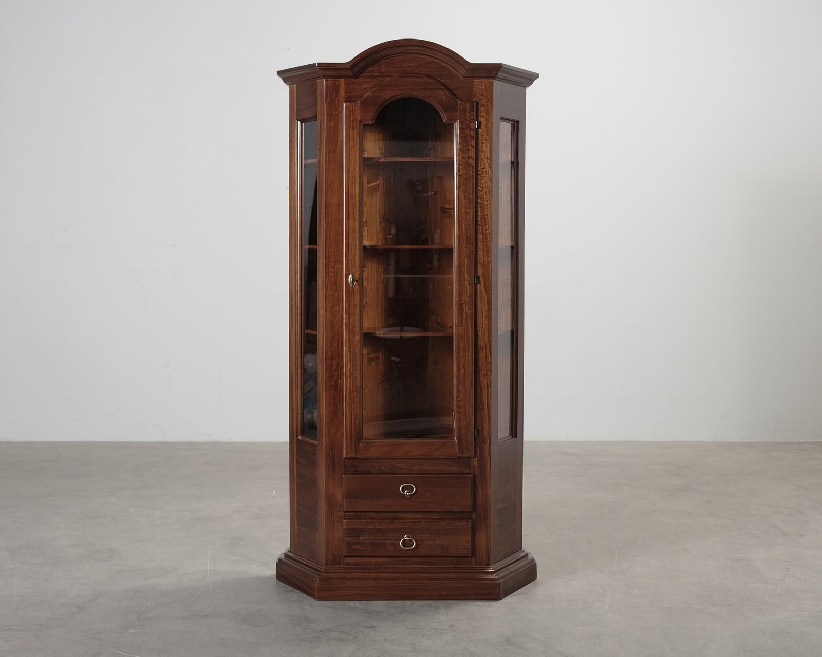 Ett vackert vitrinskåp i trä med fantastiska detaljer som skapar en klassisk look för din inredning. Vitrinskåpet ger gott om förvaringsutrymme och glasdörrarna gör att du kan visa upp föremål i t.ex. vardagsrummet eller köket. Liten spricka i dörren och ett repa på nederkanten. Helhetsintrycket är mycket fint.
