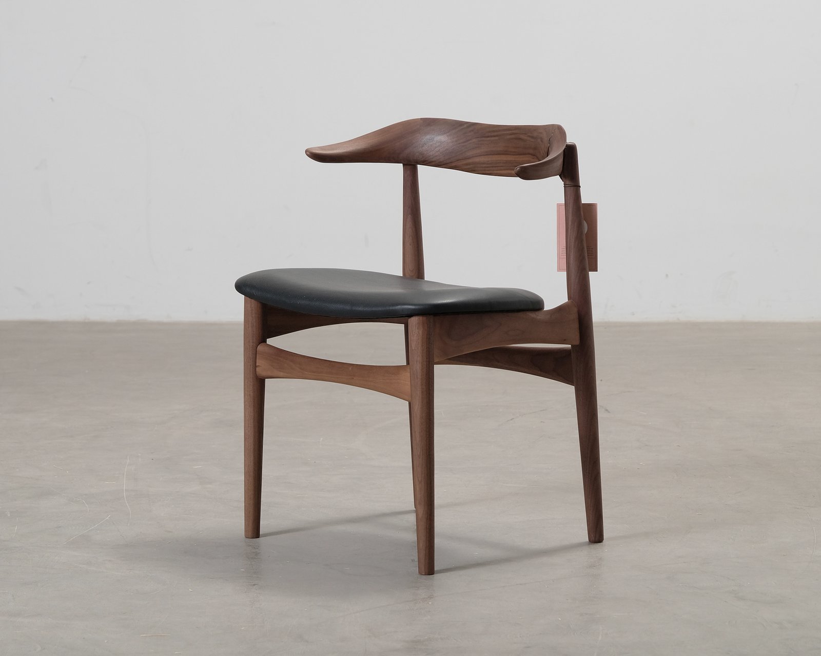 Cow Horn är en elegant matstol från Warm Nordic där dansk designtradition möter mjuk ergonomi och tidlös estetik. Stolens karakteristiska böjda ryggstöd och slanka proportioner gör den till ett stilfullt val för både matplatsen och arbetsplatsen. Stommen är tillverkad av oljad valnöt och sitsen är klädd i svart Prescott 207-läder, vilket framhäver stolens sofistikerade och högkvalitativa utförande. Cow Horn-stolen är formgiven av Knud Færch. Stolen är oanvänd, men ryggstödet har en betydande spricka.