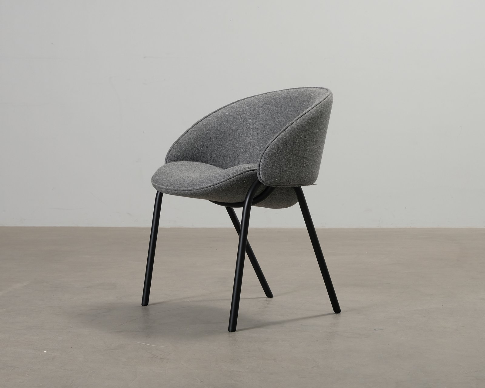 Stolsserien Folium kännetecknas av organiska linjer och mjukt omslutande former. Stolen är klädd i grått tyg och benen är tillverkade av stål. Folium stolsserien är formgiven av Mario Ferrarini för Wendelbo. Wendelbo är ett danskt familjeföretag som tillverkat innovativa och högkvalitativa möbler i över 60 år. Oanvänd.