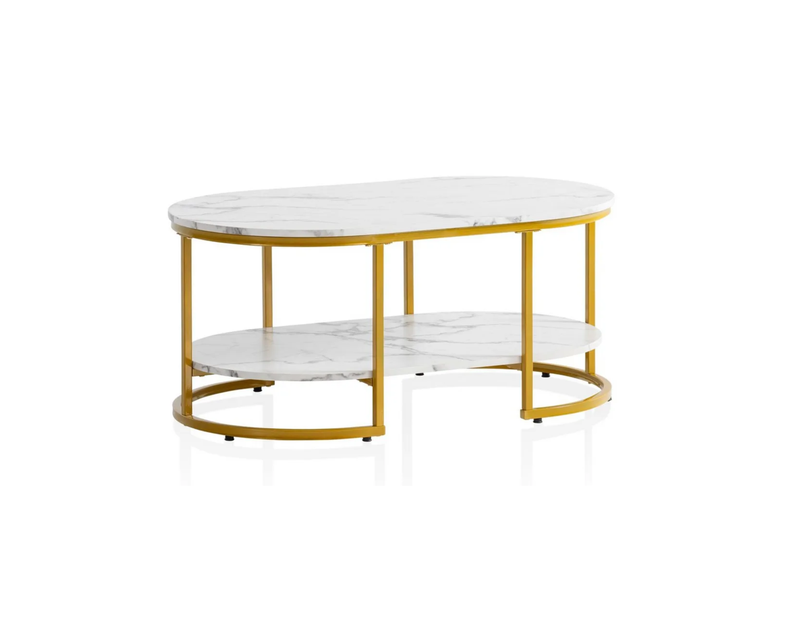 Ett stilrent ovalformat soffbord som ger vardagsrummet en elegant finish. Den guldfärgade ramen och marmormönstrade bordsskivan ger inredningen en lyxig känsla. Bordsskivan är tillverkad av MDF och ramen av metall. Bordsskivan har några små märken / skador. Helhetsintrycket är bra.