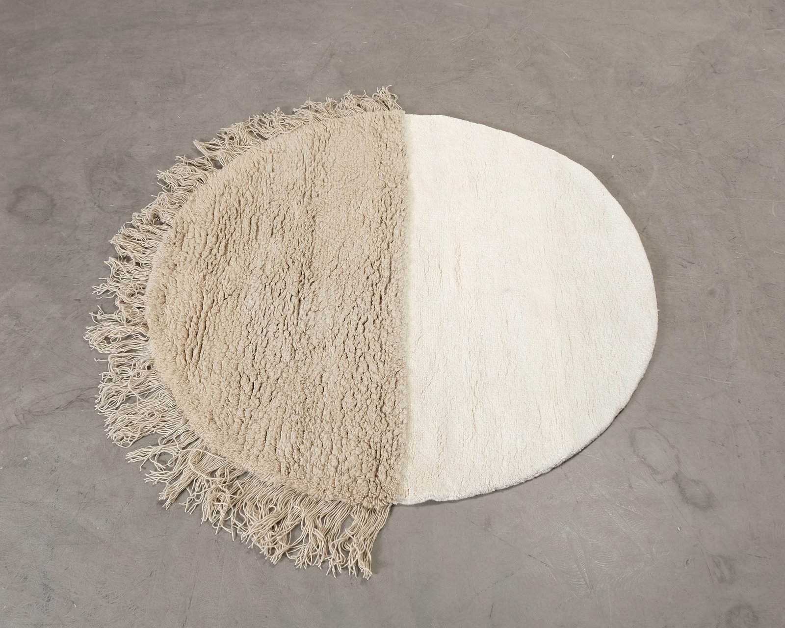 Woven Works runda matta Arc charmar med sin speciella form, härliga textur och lekfulla nyansskillnader. Mattan är designad av Laura Seppänen och är vävd i varm och mjuk Nya Zeeland-ull. Mattan är oanvänd, men det finns en mindre färgvariation i den vita delen samt ett par mörka fläckar. Helhetsintrycket är fint.