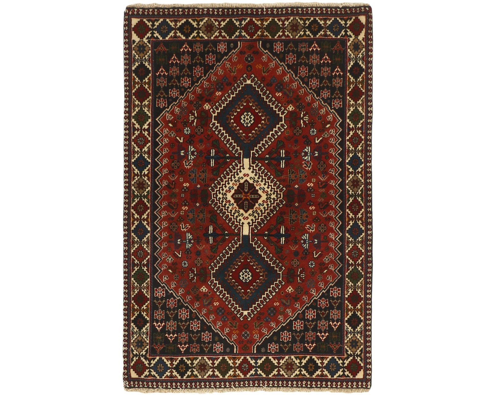 Yalameh-mattorna är handknutna ullmattor som kännetecknas av geometriska, tribala mönster i starka färger. Ullgarnet är maskinspunnet men har en mjuk lyster, och de traditionella motiven skapar en livfull, men samtidigt välstrukturerad yta. Knuttätheten ligger mellan 250 000 och 350 000 knutar per kvadratmeter. Oanvänd.