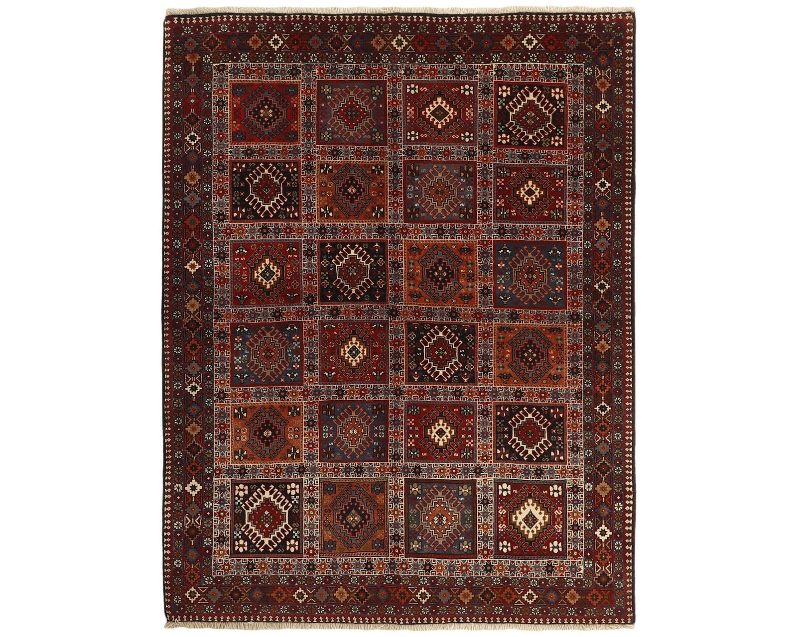 Yalameh-mattorna är handknutna ullmattor som kännetecknas av geometriska, tribala mönster i starka färger. Ullgarnet är maskinspunnet men har en mjuk lyster, och de traditionella motiven skapar en livfull, men samtidigt välstrukturerad yta. Knuttätheten ligger mellan 250 000 och 350 000 knutar per kvadratmeter. Oanvänd.