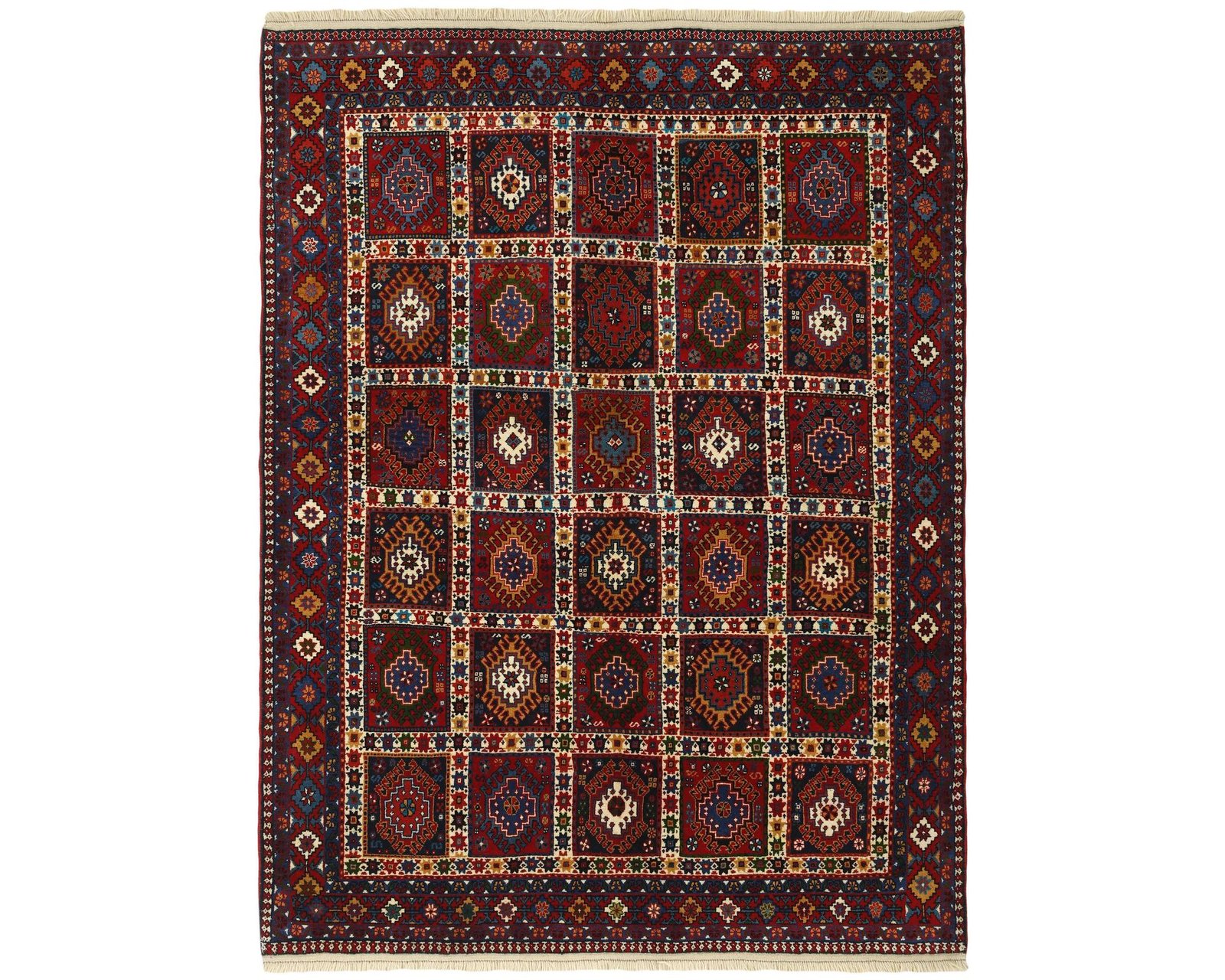 Yalameh-mattorna är handknutna ullmattor som kännetecknas av geometriska, tribala mönster i starka färger. Ullgarnet är maskinspunnet men har en mjuk lyster, och de traditionella motiven skapar en livfull, men samtidigt välstrukturerad yta. Knuttätheten ligger mellan 250 000 och 350 000 knutar per kvadratmeter. Oanvänd.