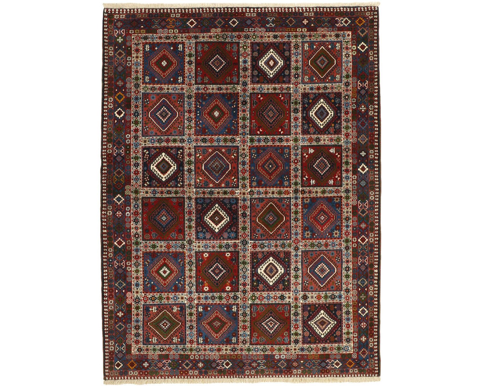Yalameh-mattorna är handknutna ullmattor som kännetecknas av geometriska, tribala mönster i starka färger. Ullgarnet är maskinspunnet men har en mjuk lyster, och de traditionella motiven skapar en livfull, men samtidigt välstrukturerad yta. Knuttätheten ligger mellan 250 000 och 350 000 knutar per kvadratmeter. Oanvänd.