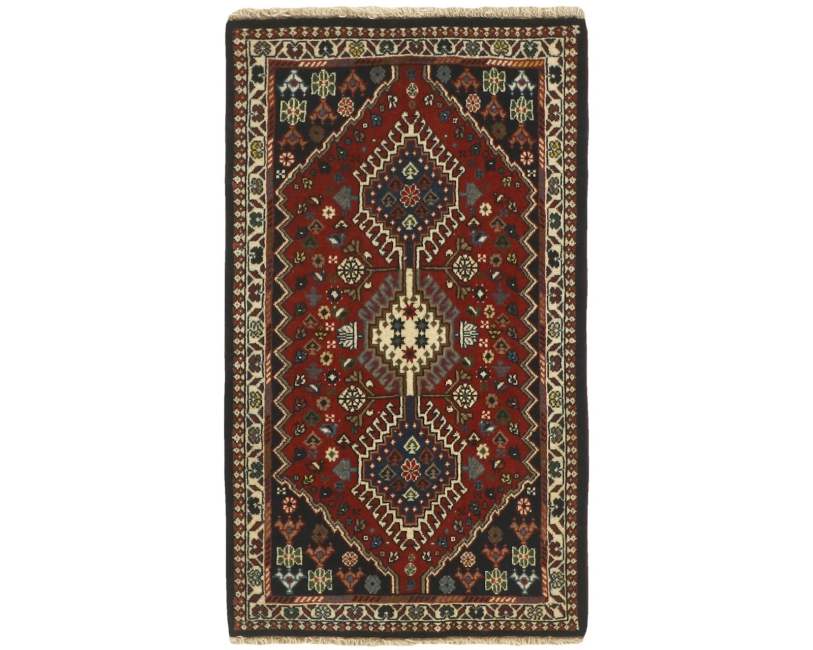 Yalameh-mattorna är handknutna ullmattor som kännetecknas av geometriska, tribala mönster i starka färger. Ullgarnet är maskinspunnet men har en mjuk lyster, och de traditionella motiven skapar en livfull, men samtidigt välstrukturerad yta. Knuttätheten ligger mellan 250 000 och 350 000 knutar per kvadratmeter. Oanvänd.