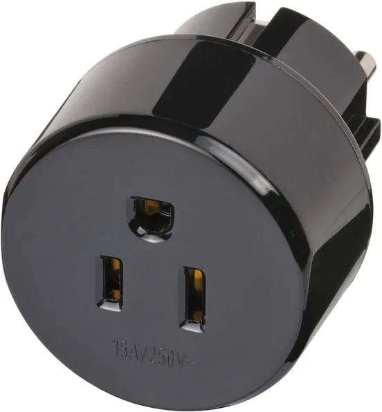 Brennenstuhl matkasovitin, liitä Amerikkalainen/Japanilainen laite EU-pistokkeeseen, kosketussuoja, maadoitettu, musta Max 15 A 250V.